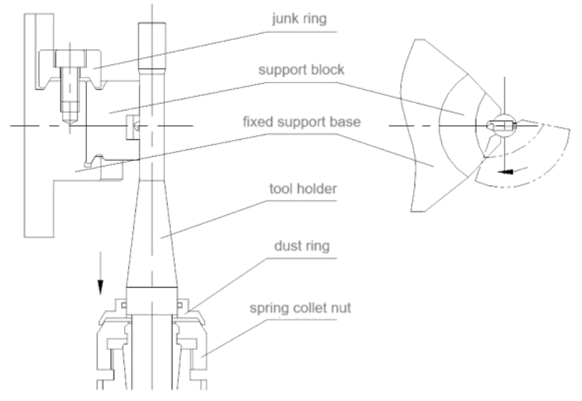● Struktur sokongan pemotong terbang menarik ciri-ciri jenis alat mesin yang sama di Itali. Blok sokongan disokong oleh permukaan arka, yang mempunyai kesan sokongan yang baik; Arbor pemotong ditetapkan dengan kacang chuck spring; Pada masa yang sama, hujung bergerak digunakan di bahagian atas arbor pemotong untuk meningkatkan ketegaran dan ketepatan arbor pemotong. Pemotong terbang mempunyai struktur yang munasabah, memberikan ketegaran yang tinggi dan ketepatan yang tinggi.
